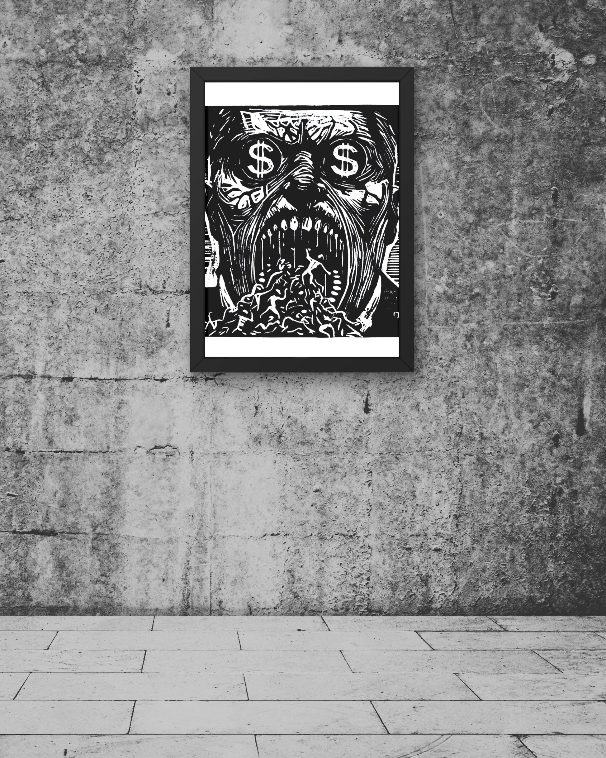 Ręcznie odbity linoryt przedstawiający twarz pożerającą ludzi, z oczami zamienionymi w symbole dolara.